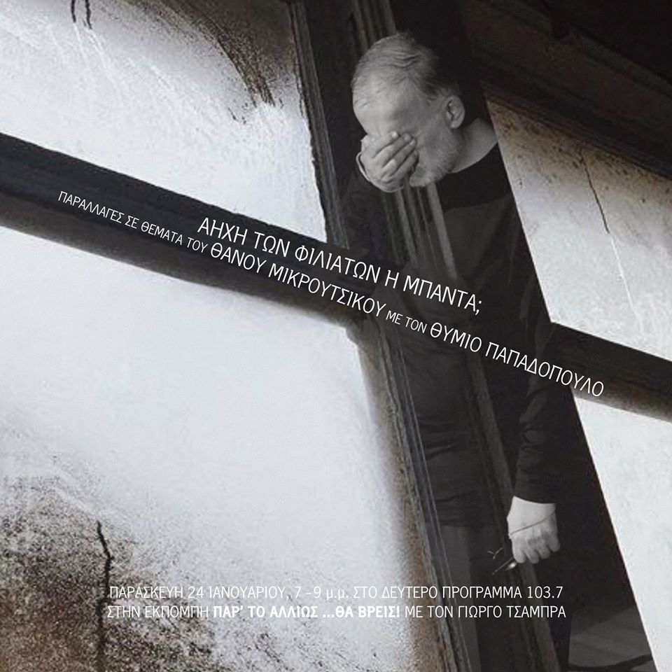 Καταγραφή σε ήχο και σε λόγο μιας πολύχρονης σχέσης ενός μουσικού με ένα δημιουργό, Παρασκευή 24 Ιανουαρίου, 7 με 9 το βράδυ, στο ΔΕΥΤΕΡΟ Πρόγραμμα 103.7… Ξεχωριστός εκτελεστής για το κλαρίνο, το φλάουτο και το σαξόφωνο ο ΘΥΜΙΟΣ ΠΑΠΑΔΟΠΟΥΛΟΣ… Μιλάμε μαζί του για τις δεκαετίες συνεργασίας με τον ΘΑΝΟ ΜΙΚΡΟΥΤΣΙΚΟ και ακούμε χαρακτηριστικές ηχογραφήσεις απ’ όλα αυτά τα χρόνια. Από την πρώτη συνάντησή τους, όταν ο Θύμιος Παπαδόπουλος έπαιξε σαξόφωνο για τους ΕΦΤΑ ΝΑΝΟΥΣ στο s/s CYRENIE -στην εκτέλεση με την Χαρούλα Αλεξίου στο Η ΑΓΑΠΗ ΕΙΝΑΙ ΖΑΛΗ (1986)-, μέχρι τις πολλές εμπειρίες των τελευταίων χρόνων, στη σκηνή και στα δισκογραφικά στούντιο. Ο ΚΑΒΑΦΗΣ του Θάνου Μικρούτσικου, οι ΓΡΑΜΜΕΣ ΤΩΝ ΟΡΙΖΟΝΤΩΝ, ο ΑΜΛΕΤ ΤΗΣ ΣΕΛΗΝΗΣ, ΣΤΟΥ ΑΙΩΝΑ ΤΗΝ ΠΑΡΑΓΚΑ και ΣΤΗΝ ΟΜΙΧΛΗ ΤΩΝ ΚΑΙΡΩΝ… 35 χρόνια, πολλά έργα, αμέτρητες στιγμές και εμπειρίες… Πάντα με τη διάθεση του «ΠΑΡ’ ΤΟ ΑΛΛΙΩΣ… ΘΑ ΒΡΕΙΣ!».