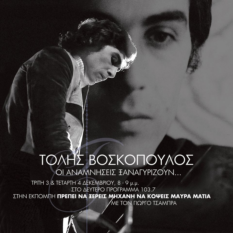 Την Τρίτη 3 και την Τετάρτη 4 Δεκεμβρίου 2019, 8 με 9 το βράδυ στο ΔΕΥΤΕΡΟ πρόγραμμα 103.7,ο Τόλης Βοσκόπουλος ως συνθέτης και ο τραγουδιστής Βοσκόπουλος σε επανεκτελέσεις… Τραγούδια που έγραψε ο Βοσκόπουλος και τραγούδησαν η ΚΑΙΤΗ ΓΚΡΕΥ, η ΔΟΥΚΙΣΣΑ, η ΜΑΡΙΝΕΛΛΑ, η ΤΖΕΝΗ ΒΑΝΟΥ, η ΠΙΤΣΑ ΠΑΠΑΔΟΠΟΥΛΟΥ, ο ΣΤΡΑΤΟΣ ΔΙΟΝΥΣΙΟΥ αλλά και η ΧΑΡΙΣ ΑΛΕΞΙΟΥ… Ο Βοσκόπουλος τραγουδά …ΘΕΟΔΩΡΑΚΗ, ΧΙΩΤΗ, ΤΣΙΤΣΑΝΗ, ΚΑΛΔΑΡΑ αλλά και ΑΚΗ ΠΑΝΟΥ… Πάντα με την πεποίθηση και με στόχο ότι «ΠΡΕΠΕΙ ΝΑ ΞΕΡΕΙΣ ΜΗΧΑΝΗ ΝΑ ΚΟΨΕΙΣ ΜΑΥΡΑ ΜΑΤΙΑ».