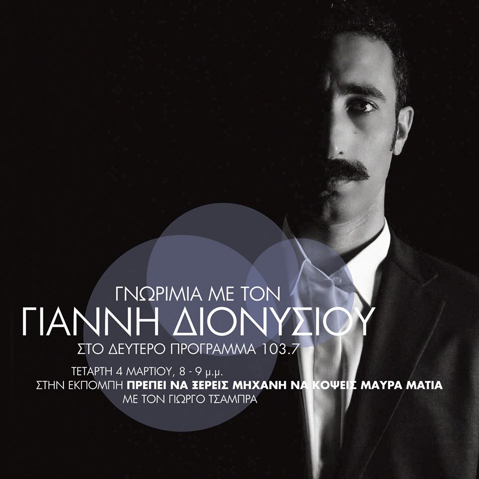 ΓΝΩΡΙΜΙΑ με τον ΓΙΑΝΝΗ ΔΙΟΝΥΣΙΟΥ, την Τετάρτη 4 Μαρτίου 2020, 8 με 9 το βράδυ, στην εκπομπή του ΓΙΩΡΓΟΥ ΤΣΑΜΠΡΑ. Ξεχωριστός λαϊκός τραγουδιστής της …μετα-δισκογραφικής περιόδου. Τριάντα χρονών σήμερα, τον μάθαμε μέσα από εκδηλώσεις και επί σκηνής παρουσίες τραγουδιών που έχουν να κάνουν με την αστική λαϊκή παράδοση ( σμυρναίικα, ρεμπέτικα και νεώτερα λαϊκά ). Γεννήθηκε στην Λεμεσό της Κύπρου, από τα 8 του χρόνια σπουδάζει μουσική ( βιολί, πιάνο, θεωρητικά ), ειδικεύτηκε στην Ψαλτική Τέχνη με σπουδές στην Θεσσαλονίκη και στην Αθήνα. Μέλος κάποιων από τα νεώτερα λαϊκά συγκροτήματα της Θεσσαλονίκης ( Για.Για.Κω, Ηλιοδρόμιο, Αλέντι, Βασίλης Πετρίδης και Γκαϊλέ ), υπήρξε ερμηνευτής σε αρκετές από τις νεώτερες δημιουργικές ανησυχίες τους. Ωστόσο, τα τελευταία χρόνια συνδέθηκε περισσότερο με σύγχρονες ερμηνείες κάποιων από τα «χρυσά λαϊκά» της δεκαετίας ’50 – ’60, σε συνεργασία με τον σολίστα του μπουζουκιού Γιώργο Γεωργόπουλο. Η εκπομπή φιλοδοξεί να περιγράψει αυτή τη διαδρομή, μεταφέροντας την ανθρώπινη εμπειρία της, χωρίς τον ενθουσιασμό των δελτίων τύπου. Φυσικά, με όσες μουσικές επιλογές την καθόρισαν και …χωράνε. Πάντα με την πεποίθηση και με στόχο ότι «ΠΡΕΠΕΙ ΝΑ ΞΕΡΕΙΣ ΜΗΧΑΝΗ ΝΑ ΚΟΨΕΙΣ ΜΑΥΡΑ ΜΑΤΙΑ».