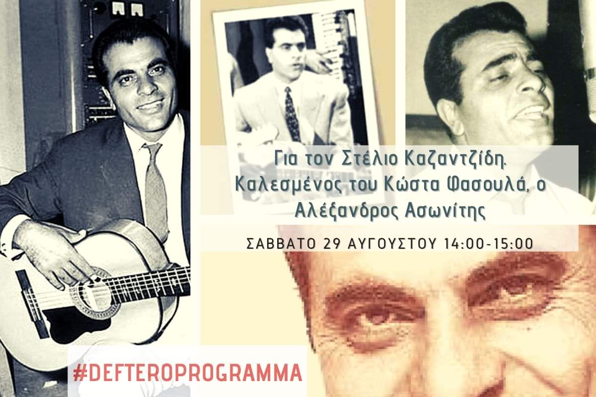 Με αφορμή τη γενέθλια ημέρα του Στέλιου Καζαντζίδη (29 Αυγούστου 1931), ο Κώστας Φασουλάς, το Σάββατο 29 Αυγούστου 2020 και ώρα 14:00 στο #defteroprogramma, συνομιλεί με τον συγγραφέα και μελετητή του λαϊκού τραγουδιού Αλέξανδρο Ασωνίτη, για τη μοναδικότητα του Στέλιου Καζαντζίδη στο ελληνικό δισκογραφικό τοπίο, την ταύτισή του με το κοινωνικό λαϊκό τραγούδι και την πρωτοφανή αποδοχή που γνώρισε, κατά τη διάρκεια της πορείας του.