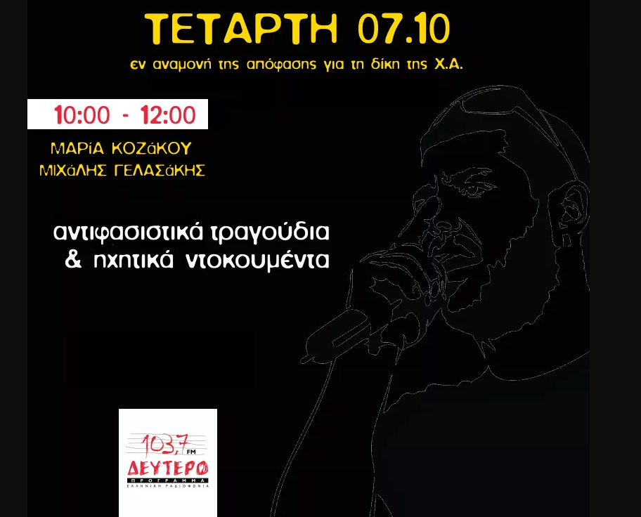 Ηχητικά ντοκουμέντα με τον Μάνο Χατζιδάκι και τον Θάνο Μικρούτσικο. Τραγούδια του Μίκη Θεοδωράκη –μεταξύ άλλων- από την Πολιτεία Α΄ και Β΄ ή το χιλιοτραγουδισμένο «Ποιος τη ζωή μου», σε στίχους Μάνου Ελευθερίου. Και φυσικά, τραγούδια του Μάνου Λοΐζου, περιλαμβάνει το αφιέρωμα που του Δεύτερου Προγράμματος την Τετάρτη 7 Οκτωβρίου 2020, από τις 10 το πρωί έως τις 12 το μεσημέρι, με τη Μαρία Κοζάκου και τον Μιχάλη Γελασάκη ακριβώς την ώρα της ανακοίνωσης της απόφασης για τη Δίκη της Χρυσής Αυγής.