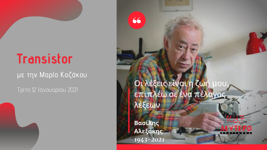 Τρίτη 12 Ιανουαρίου, λίγο μετά τις 9:30, στην εκπομπή “Transistor” η Μαρία Κοζάκου συνομιλεί με την Eλένη Μπούρα, επιμελήτρια των εκδόσεων του Βασίλη Αλεξάκη (Εκδόσεις Μεταίχμιο) και τον Γιάννη Μπασκόζο από τον oanagnostis.gr. Ένας μικρός φόρος τιμής σε ένα σημαντικό συγγραφέας και διανοητή.