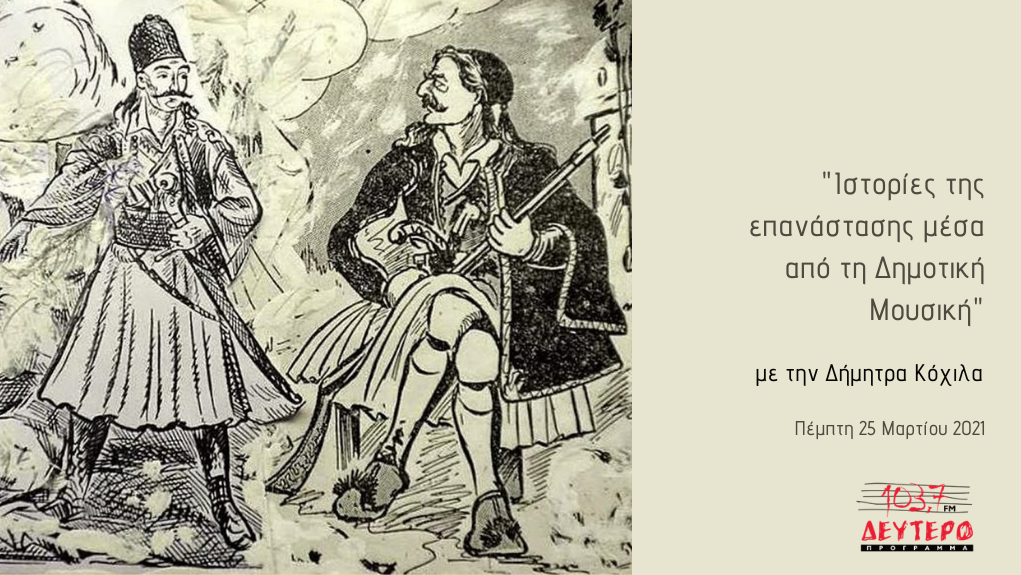Ιστορίες της επανάστασης στο “Δέντρο της Μουσικής”. Πραγματικές ιστορίες ηρωισμού και ανδρείας επώνυμων και ανώνυμων στα πεδία των μαχών, αλλά και στα μετόπισθεν. Tα τραγούδια της Επανάστασης, που “σκαρώθηκαν” στα κλέφτικα λημέρια, -εκεί που γιγαντώθηκε η ιδέα για την ελευθέρια- που ύμνησαν τον άνδρα, τον ήρωα, την γυναίκα, την μάνα, το χωριό, την φύση, έδωσαν δύναμη σε εκείνους που βγήκαν να πολεμήσουν, ψελλίζοντας το στα χείλη τους. Εκτάκτως, την Πέμπτη 25 Μαρτίου στις 3.00 το μεσημέρι, με την Δήμητρα Κόχιλα.