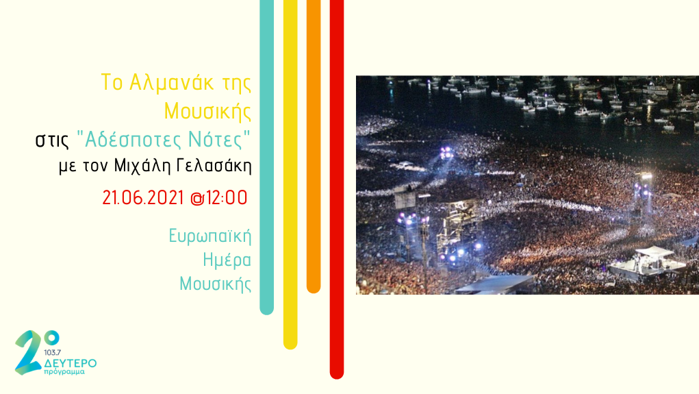 Σήμερα, εκτός από του Αγίου Πνεύματος και το θερινό ηλιοστάσιο (η μεγαλύτερη μέρα του χρόνου) γιορτάζουμε και την Ευρωπαϊκή Ημέρα Μουσικής, που με τα χρόνια έγινε Παγκόσμια Ημέρα Μουσικής. Στις “Αδέσποτες Νότες” με τον Μιχάλη Γελασάκη, 12:00 – 14:00, ακούμε ένα ιδιότυπο μουσικό Αλμανάκ με τις πολυπληθέστερες συναυλίες όλων των εποχών, τους δίσκους με τις περισσότερες πωλήσεις, τα πιο διασκευασμένα τραγούδια, τα μουσικά είδη που έχουν καταγραφεί και πολλά άλλα.