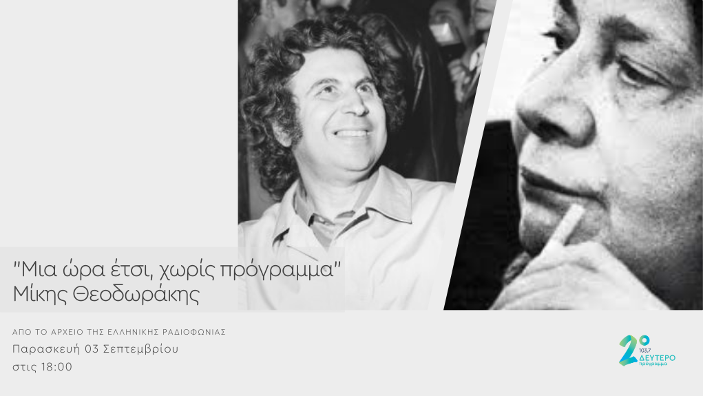 Παρασκευή 03 Σεπτεμβρίου, στις 18:00. Από το αρχείο της Ελληνικής Ραδιοφωνίας ακούμε συνέντευξη του Μίκη Θεοδωράκη στη Μαρία Ρεζάν του 1983, στην εκπομπή της “Μια ώρα έτσι χωρίς πρόγραμμα”, με αναφορές στα πολιτικά γεγονότα της τότε εποχής.