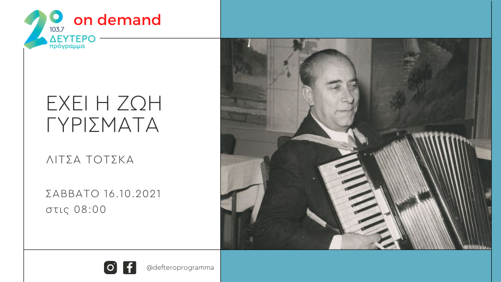 «Έχει η ζωή γυρίσματα» Μία δίωρη ραδιοφωνική περιπλάνηση, τα πρωινά του Σαββατοκύριακου. Σελίδες πολιτισμού, ιστορίες για την Τέχνη και την επιστήμη, πρόσωπα γνωστά και άγνωστα που οι επιλογές τους άνοιξαν δρόμους, ερωτήσεις που γεννούν αναπάντεχες απαντήσεις, σε μία δίωρη ραδιοφωνική περιπλάνηση, τα πρωινά του Σαββατοκύριακου στο Δεύτερο Πρόγραμμα, συντροφιά με τη Λίτσα Τότσκα. Όπως είπε και ο Σοφοκλής: «Ο χρόνος αποκαλύπτει τα πάντα και τα φέρνει στο φως»