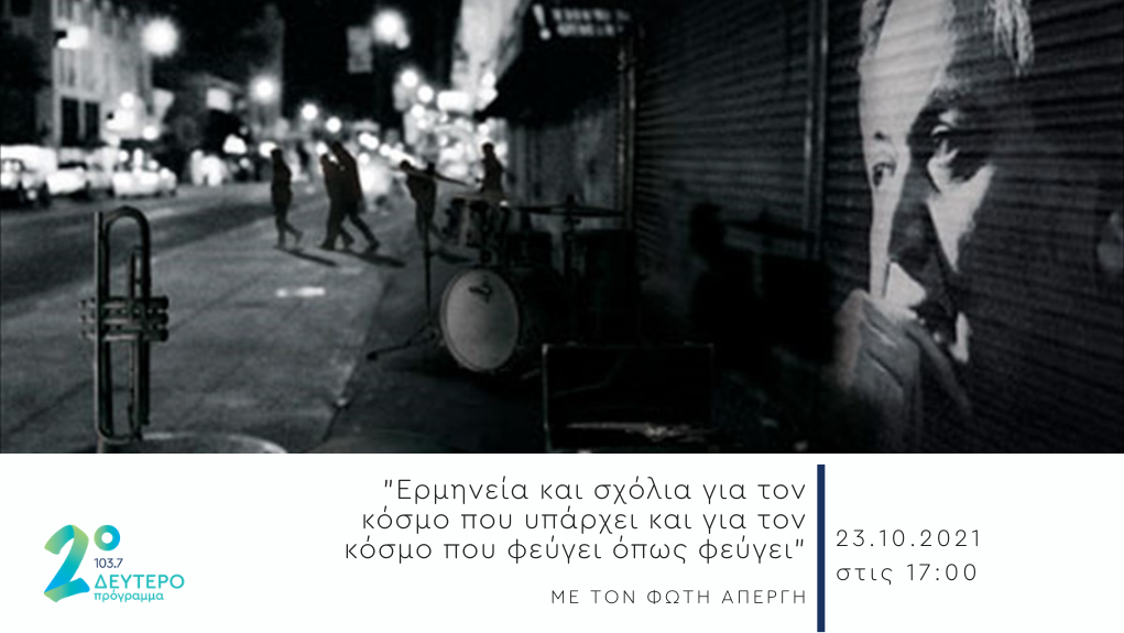 Σάββατο 23 Οκτωβρίου, 17:00-18:00, «Ερμηνεία και σχόλια για τον κόσμο που υπάρχει και για τον κόσμο που φεύγει όπως φεύγει» με τον Φώτη Απέργη.