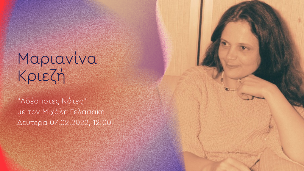 Δευτέρα 07 Φεβρουαρίου, 12:00-13:00, στις “Αδέσποτες Νότες” ο Μιχάλης Γελασάκης διαβάζει αποσπάσματα από συνεντεύξεις, στη μνήμη της Μαριανίνας Κριεζή (1947-2022).