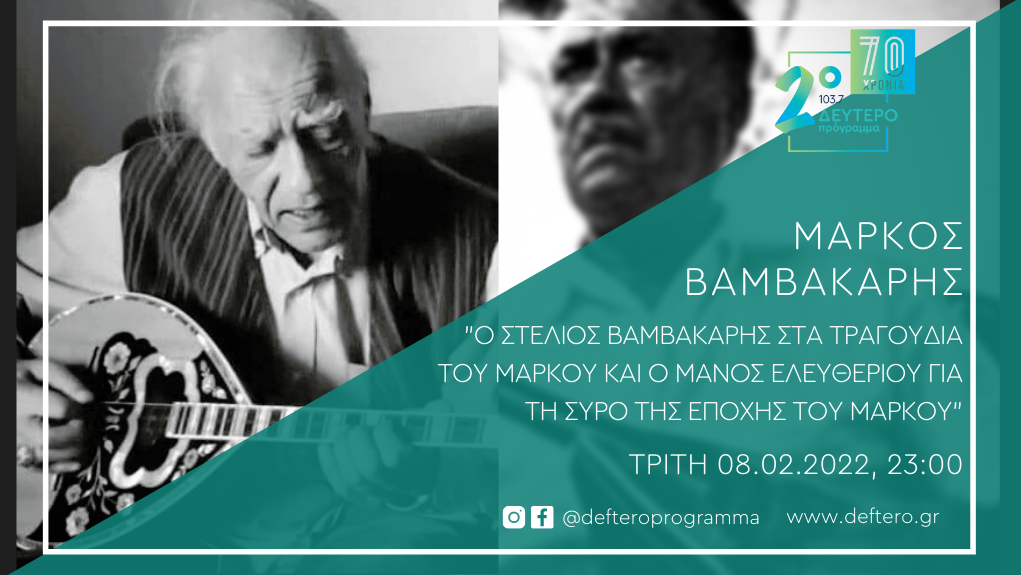 Τρίτη 08 Φεβρουαρίου, 23:00-01:00, «Ο Στέλιος Βαμβακάρης στα τραγούδια του Μάρκου και ο Μάνος Ελευθερίου για τη Σύρο της εποχής του Μάρκου».