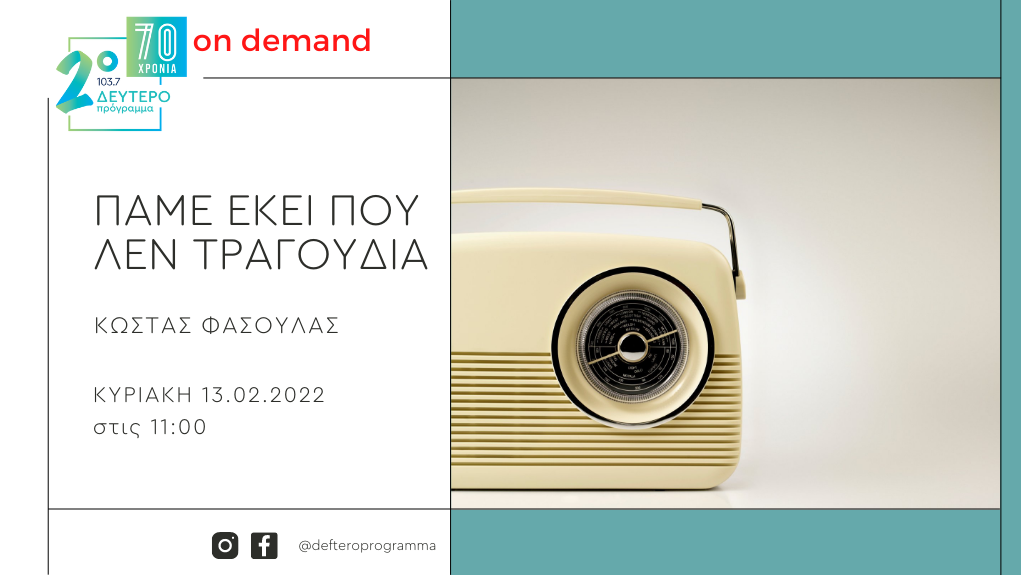 Κυριακή 13 Φεβρουαρίου, 11:00-13:00, Ο Κώστας Φασουλάς στην εκπομπή «Πάμε εκεί που λεν τραγούδια» παρουσιάζει στιγμές των ακροατών από το προσωπικό του ραδιοφωνικό ημερολόγιο. Στιγμές χιουμοριστικές, αλλά και δύσκολες, γεμάτες συναίσθημα, όπως εξάλλου είναι το ραδιόφωνο.