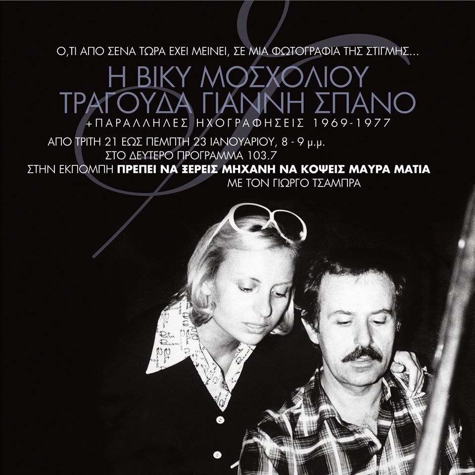 «ΟΤΙ ΑΠΟ ΣΕΝΑ ΤΩΡΑ ΕΧΕΙ ΜΕΙΝΕΙ, ΣΕ ΜΙΑ ΦΩΤΟΓΡΑΦΙΑ ΤΗΣ ΣΤΙΓΜΗΣ -… Η ΜΟΣΧΟΛΙΟΥ τραγουδά ΣΠΑΝΟ + Παράλληλες ηχογραφήσεις 1969-1977». Την Τρίτη 21, την Τετάρτη 22 και την Πέμπτη 23 Ιανουαρίου, 8 με 9 το βράδυ, στην εκπομπή του ΓΙΩΡΓΟΥ ΤΣΑΜΠΡΑ. Είναι 20 τα τραγούδια του ΓΙΑΝΝΗ ΣΠΑΝΟΥ που ηχογράφησε η ΒΙΚΥ ΜΟΣΧΟΛΙΟΥ… Είναι όμως και δυο εποχές… Καθώς τελειώνει η δεκαετία του ’60, πρώτα. «Μια Κυριακή» και «Το Σαββατόβραδο»… Κι ύστερα, το 1977. «Η Μοσχολιού τραγουδά Σπανό»: Η «Μαρκίζα», οι «Άνθρωποι μονάχοι», ο «Ναύτης» -που «βγήκε στη στεριά»-, το «Εξπρές», αλλά και το «Πέφτει μια βροχή», «Η ξένη πόλη», η «Ώρα αναχωρήσεως»… Κι αν οι ηχογραφήσεις είναι «φωτογραφία της στιγμής», κάθε εποχή που έρχεται μετά, βλέπει τους τραγουδιστές και τα τραγούδια με το δικό της τρόπο. Στις τρεις εκπομπές, ακούμε τα 20 τραγούδια που ηχογράφησαν μαζί… Παρακολουθήσαμε όμως και τις παράλληλες επιλογές του ΣΠΑΝΟΥ και της ΜΟΣΧΟΛΙΟΥ, καθώς και το γενικότερο κλίμα μέσα στο οποίο έγιναν αυτές. Βλέποντας την πορεία τους από εκείνα τα χρόνια και μετά, μέσα σ’ ένα ευρύτερο μουσικό και κοινωνικό ψηφιδωτό. Πάντα με την πεποίθηση και με στόχο ότι «ΠΡΕΠΕΙ ΝΑ ΞΕΡΕΙΣ ΜΗΧΑΝΗ ΝΑ ΚΟΨΕΙΣ ΜΑΥΡΑ ΜΑΤΙΑ».