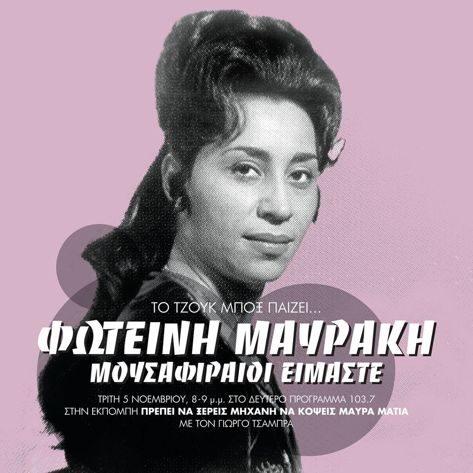 ΤΟ ΤΖΟΥΚ ΜΠΟΞ ΠΑΙΖΕΙ… ΦΩΤΕΙΝΗ ΜΑΥΡΑΚΗ : ΜΟΥΣΑΦΙΡΑΙΟΙ ΕΙΜΑΣΤΕ… Την Τρίτη 5 Νοεμβρίου 2019, 8 με 9 το βράδυ, στο ΔΕΥΤΕΡΟ πρόγραμμα 103.7. Μια λαϊκή τραγουδίστρια της εποχής των τζουκ μποξ, επιλογές από την δισκογραφία της και μια πολύ προσωπική προσέγγιση στην διαδρομή της. Όταν γύρω στα 2011, της ζήτησα να έρθει στο ραδιόφωνο και να μιλήσουμε για την πορεία της, μού απάντησε ότι «δεν είναι πια ευχάριστο θέαμα» κι ότι «τα έχει εγκαταλείψει χρόνια και δεν θέλει να επιστρέψει». Έφυγε στις 4 Νοέμβρη του 2015… Χαρακτηριστική φιγούρα της «ανατολικής» πλευράς του ελληνικού τραγουδιού. Στον «τρόπο» της, βρήκαν θέση ο αμανές αλλά και βαριά ζεϊμπέκικα, στα χρόνια του ’70. Στα τζουκ μποξ, στους πειρατικούς σταθμούς, στα κέντρα της …Β’ Πειραιά… «Μουσαφιραίοι είμαστε / στο χώμα που πατάμε», « Βάλτε στον ήλιο κλειδαριά», «Τα βάσανα με ζώσανε», Μη με παρακαλάς / τα λόγια σου χαλάς» ( με την απίστευτη κατάληξη « Τέτοιο φινάλε άσχημο/ μονάχος σου το ήθελες έσπειρες μαύρο άνεμο / θέριζε τώρα θύελλες») και πολλά άλλα… Κάποια μετράνε εκατοντάδες χιλιάδες θεάσεις και στην εποχή του …You tube!