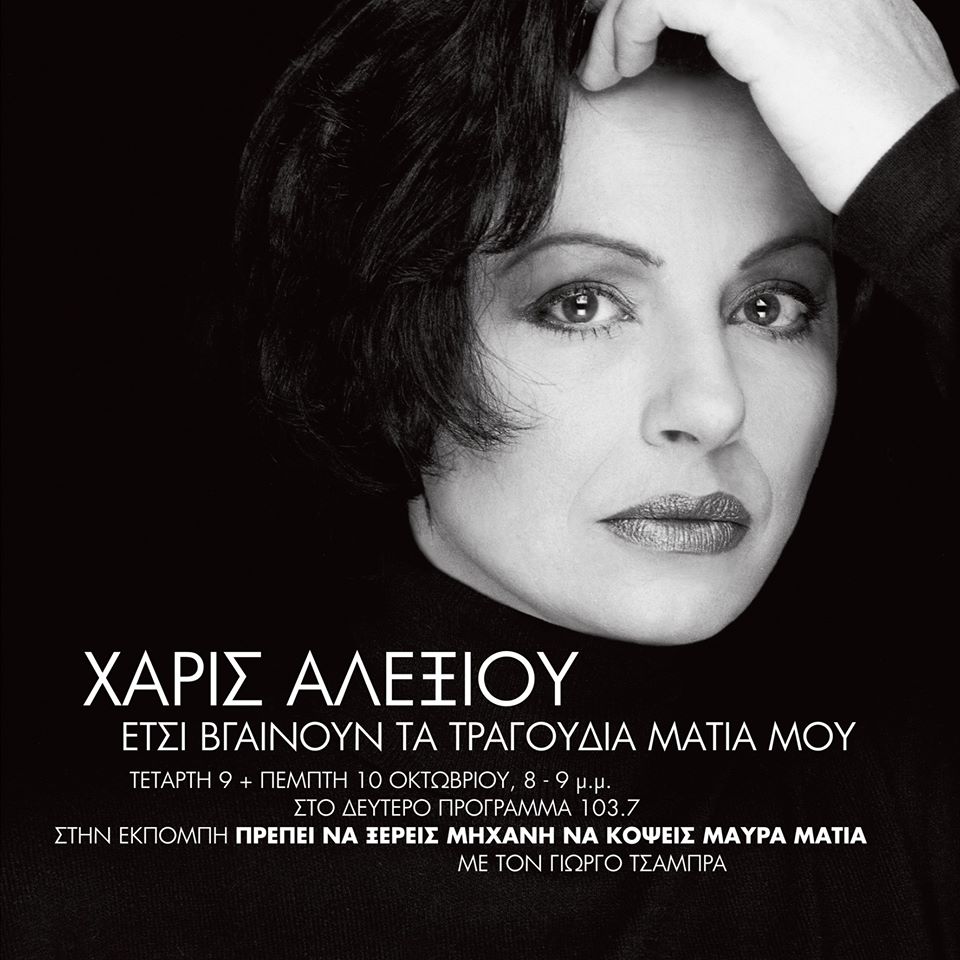 «Έτσι βγαίνουν τα τραγούδια μάτια μου…» : Μού ‘χε λείψει η ευρύτερη δισκογραφία με την ΧΑΡΙΣ ΑΛΕΞΙΟΥ. Έτσι επέλεξα τα τραγούδια της εκπομπής, Την Τετάρτη 9 και την Πέμπτη 10 Οκτωβρίου 2019… 8 με 9 το βράδυ, στο ΔΕΥΤΕΡΟ 103.7. Με – σχεδόν – 50 χρόνια ηχογραφήσεων,πάντα κάποιες επιλογές αντέχουν περισσότερο,πολλές μένουν πίσω στο χρόνο, κάποιες ξανάρχονται στο νου με κάποια αφορμή. Και για τις επιλογές των καλλιτεχνών και των «μέσων», αλλά και για τις επιλογές του κοινού.Αρχικά, σκέφτηκα ένα πιο συγκεκριμένο θέμα,μια συνεργασία μια εποχή… Τελικά, διάλεξα όσα χωράνε, από το σύνολο… Κάποια πολυακουσμένα που δεν ήθελα να αποφύγω, κάποια αγαπημένα που ακούγονται πιο σπάνια αλλά αξίζει να ακουστούν… Ίσως και κάποια που ανήκουν σε άλλες εποχές και αποτελούν προσωπικές μου …εμμονές.  Πάντα με γνώση ότι «ΠΡΕΠΕΙ ΝΑ ΞΕΡΕΙΣ ΜΗΧΑΝΗ ΝΑ ΚΟΨΕΙΣ ΜΑΥΡΑ ΜΑΤΙΑ»…