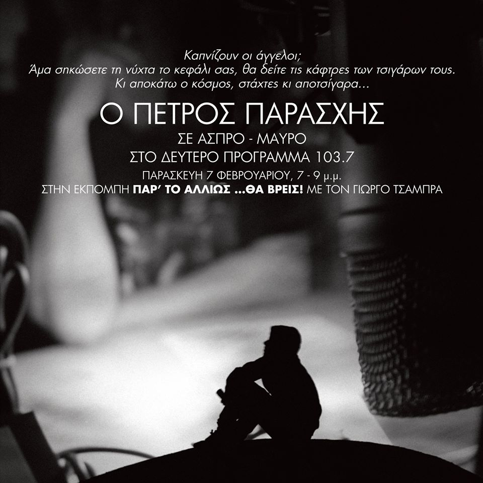O Πέτρος Παράσχης σε άσπρο-μαύρο, την Παρασκευή 7 Φεβρουαρίου 2020, 7-9 το βράδυ, στην εκπομπή “Παρ’ το αλλιώς …θα βρεις” με τον Γιώργο Τσάμπρα.