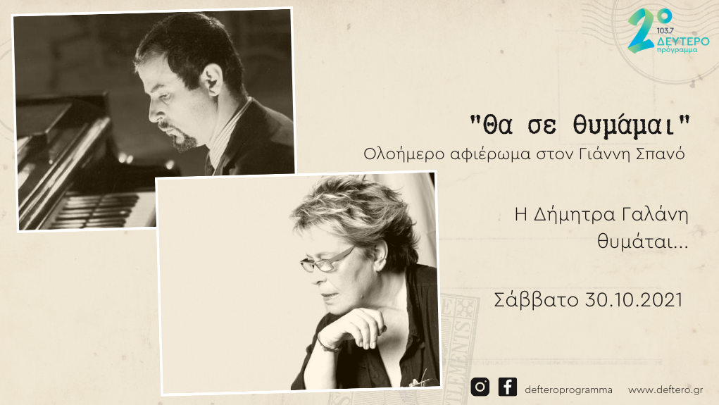 Σάββατο 30 Οκτωβρίου και το Δεύτερο Πρόγραμμα 103.7 θυμάται τον Γιάννη Σπανό. Καθ’ όλη τη διάρκεια του προγράμματος, από τις 8 το πρωί, στο ακριβώς της ώρας, σε παραγωγή του Δημήτρη Μεϊδάνη και του Μιχάλη Γελασάκη, ακούμε φίλους και συνεργάτες του να αφηγούνται όμορφες, ανθρώπινες ιστορίες από τη γνωριμία τους και τη συνεργασία τους με τον Γιάννη Σπανό, σε όλο το εύρος των 50 και πλέον χρόνων του στη δισκογραφία.