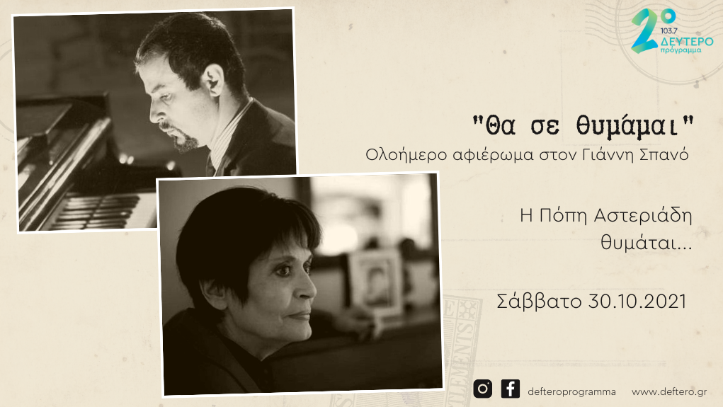 Σάββατο 30 Οκτωβρίου και το Δεύτερο Πρόγραμμα 103.7 θυμάται τον Γιάννη Σπανό. Καθ’ όλη τη διάρκεια του προγράμματος, από τις 8 το πρωί, στο ακριβώς της ώρας, σε παραγωγή του Δημήτρη Μεϊδάνη και του Μιχάλη Γελασάκη, ακούμε φίλους και συνεργάτες του να αφηγούνται όμορφες, ανθρώπινες ιστορίες από τη γνωριμία τους και τη συνεργασία τους με τον Γιάννη Σπανό, σε όλο το εύρος των 50 και πλέον χρόνων του στη δισκογραφία.