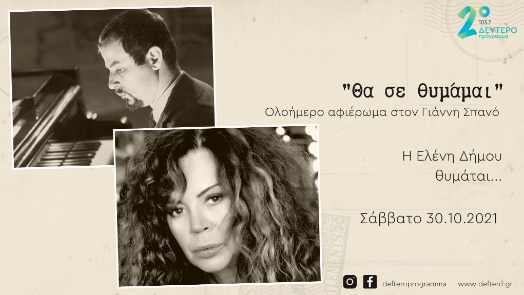 Σάββατο 30 Οκτωβρίου και το Δεύτερο Πρόγραμμα 103.7 θυμάται τον Γιάννη Σπανό. Καθ’ όλη τη διάρκεια του προγράμματος, από τις 8 το πρωί, στο ακριβώς της ώρας, σε παραγωγή του Δημήτρη Μεϊδάνη και του Μιχάλη Γελασάκη, ακούμε φίλους και συνεργάτες του να αφηγούνται όμορφες, ανθρώπινες ιστορίες από τη γνωριμία τους και τη συνεργασία τους με τον Γιάννη Σπανό, σε όλο το εύρος των 50 και πλέον χρόνων του στη δισκογραφία.