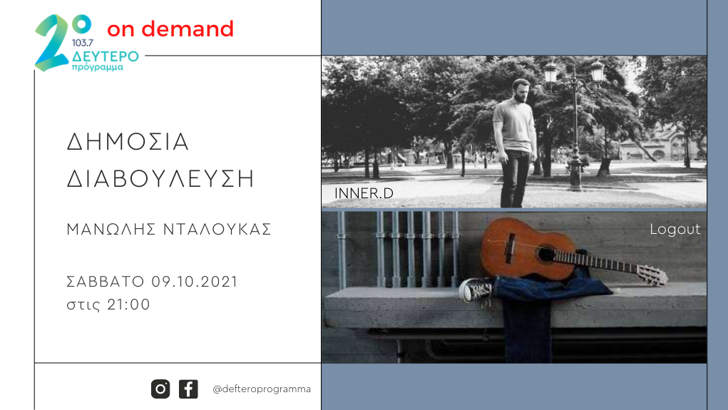 Σάββατο 09 Οκτωβρίου, στις 9 το βράδυ και στο Δεύτερο Πρόγραμμα 103,7, ο δημοσιογράφος, παραγωγός και συγγραφέας Μανώλης Νταλούκας θέτει σε «Δημόσια Διαβούλευση» νοήματα τραγουδιών και άλλων καλλιτεχνικών δράσεων. Δύο καλλιτέχνες, ο Inner.D και ο Logout μιλούν για τις πρόσφατες δουλειές τους και την καλλιτεχνική δημιουργία τον καιρό της απομόνωσης.