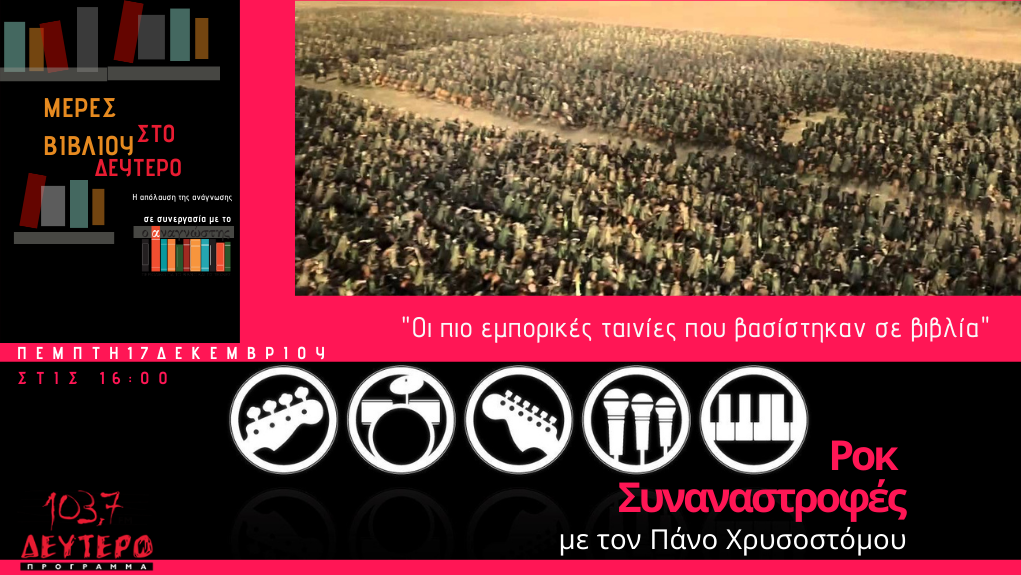 “Μέρες βιβλίου” στο Δεύτερο, με την κινηματογραφική μέρα της εκπομπής, όπως κάθε Πέμπτη, με υπότιτλο: “οι πιο εμπορικές ταινίες που βασίστηκαν σε βιβλία”. Με άλλα λόγια από τον “Αρχοντα των δαχτυλιδιών” στον “Χάρι Πότερ” και τα άλλα τα παιδιά…