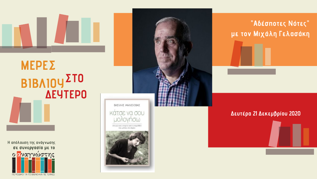 Δευτέρα 21 Δεκεμβρίου ο Μιχάλης Γελασάκης στην εκπομπή “Αδέσποτες Νότες” συζητά με τον Βασίλη Μαλισιόβα, φιλόλογος, επιμελητή εκδόσεων και λεξικογράφο – λίγο πριν την έκδοση του μεγάλου Ηπειρώτικου Λεξικού που ετοιμάζει – μιλάει για το νέο του βιβλίο με τον τίτλο «Κάτσε να σου μολογήσω» (εκδ. Αλεξάνδρεια), το οποίο περιέχει εντυπωσιακές Ηπειρώτικες ιστορίες από το παρελθόν που μιλούν στο παρόν.