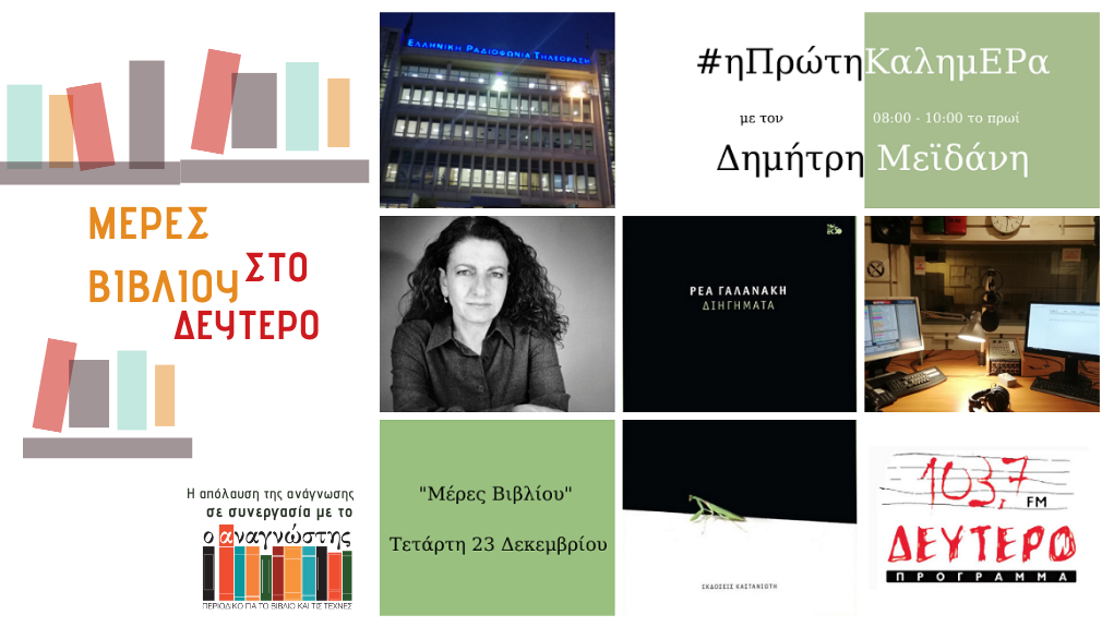 Σήμερα Τετάρτη 23 Δεκεμβρίου, η Ρέα Γαλανάκη μιλάει στην εκπομπή #ηΠρώτηΚαλημΕΡα και τον Δημήτρη Μεϊδάνη για τη νέο της βιβλίο “Διηγήματα” που κυκλοφορεί από τις Εκδόσεις Καστανιώτη