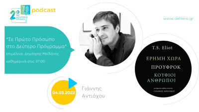 Σήμερα ο Γιάννης Αντιόχου μας μιλάει για την πρόσφατη μεταφραστική του εργασία πάνω στο ποιητικό έργο του T.S. Eliot «Έρημη Χώρα, Προύφροκ, Κούφιοι Άνθρωποι». Πρόλογος, Μετάφραση, Επίμετρο: Γιάννης Αντιόχου.