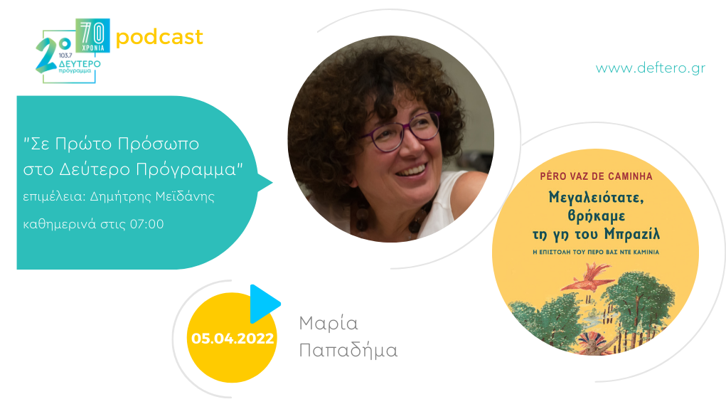 Σήμερα η Μαρία Παπαδήμα μας μιλάει για την πρόσφατη μεταφραστική της εργασία πάνω στο βιβλίο του Pero Vaz De Caminha, «Μεγαλειότατε, βρήκαμε τη γη του Μπραζίλ» (Η επιστολή του Πέρος Βας Ντε Καμίνια). Εισαγωγή- Μετάφραση – Σημειώσεις: Μαρία Παπαδήμα.