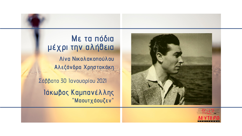 Η εκπομπή “Με τα πόδια μέχρι την αλήθεια” τιμώντας τα θύματα του Ολοκαυτώματος, ξανασυστήνει τον Ιάκωβο Καμπανέλλη, ως επιζώντα από το ναζιστικό κολαστήριο του Μαουτχάουζεν, στο οποίο βρέθηκε από τον Μάρτιο του ’42 έως τον Αύγουστο του ’45, όχι ως Εβραίος, ούτε ως αγωνιστής της Εθνικής Αντίστασης, αλλά από νεανική απερισκεψία. Η στιχουργός Λίνα Νικολακοπούλου και η δημοσιογράφος Αλεξάνδρα Χριστακάκη διαβάζουν εκτενή αποσπάσματα από το ένα και μοναδικό λογοτεχνικό του έργο “Μαουτχάουζεν”, όπου ιστορεί την ζωή του στο κολαστήριο, σαν παραμύθι με το όνομα Ιάκωβος Καμπανέλλης. Ακούγονται τα εμβληματικά τραγούδια που μελοποίησε ο Μίκης Θεοδωράκης, σε στίχους δικούς του, ενώ η κόρη του Κατερίνα, εξηγεί με ποιό τρόπο ο πατέρας της επιχειρούσε να επουλώσει το τραύμα, γιατί δεν επισκέφθηκαν ποτέ μαζί το στρατόπεδο συγκέντρωσης, γιατί διάβασε το επίμαχο βιβλίο όταν ενηλικιώθηκε, γιατί ο πατέρας της δεν αναφερόταν στην βία του ναζιστικού στρατοπέδου, γιατί δεν συναντήθηκε με άλλους επιζώντες πλην ενός από την Θεσσαλονίκη. Στο Δεύτερο Πρόγραμμα, Σάββατο 30 Ιανουαρίου 2021 στις 18.00.