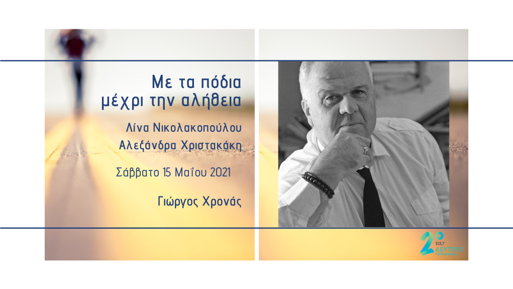Σάββατο 15 Μάϊου 2021, “Με τα πόδια μέχρι την αλήθεια”. Καλεσμένος ο Γιώργος Χρονάς. Ποιητής, στιχουργός, συγγραφέας, εκδότης. Με τα χρονογραφήματα του ταξιδεύουμε σε άλλους τόπους και χρόνους. Μας συστήνει τον Χατζηδάκι, τον Γκάτσο, τον Χριστιανόπουλο, τον Ασλάνογλου, τον Πεντζίκη, τον Βαρβέρη, τον Κατσαρό, τον Άκη Πάνου, τον Τσαρούχη, τον Ταχτσή, την Μαρία Κάλλας, τον Τενεσσί Ουίλιαμς, τον Μάικλ Τζάκσον. Ποιητής των μικρών στιγμών των μεγάλων δασκάλων της τέχνης και των εξαιρετικών αισθημάτων. Ο γιός του εμποράκου στην οδό Αισχύλου στου Ψυρρή, που πουλούσε τσουβάλια και νήματα, ο Γιώργος Χρονάς, μετάτρεψε σε ήρωες των ποιημάτων του και των τραγουδιών του τους αμόρφωτους που ταλαιπωρήθηκαν από τους δήθεν μορφωμένους. Από τον Πειραιά και τα Ταμπούρια βρέθηκε στις Εκδόσεις “Οδός Πανός” στα Εξάρχεια, να εκδίδει το ομώνυμο περιοδικό, επί 40 συνεχή έτη. Βρέθηκε στο Τρίτο και στο Δεύτερο Πρόγραμμα της Ε.ΡΑ, με πρόσκληση του Χατζηδάκι ως ραδιοφωνικός παραγωγός σε εκπομπές λόγου με τον ευφάνταστο τίτλο “Ξενοδοχείο Βαλκάνια” . Έγραψε στίχους για 140 τραγούδια, που μελοποιήθηκαν μεταξύ άλλων, από τον Μαρκόπουλο, τον Χατζηδάκι, τον Ανδρέου.