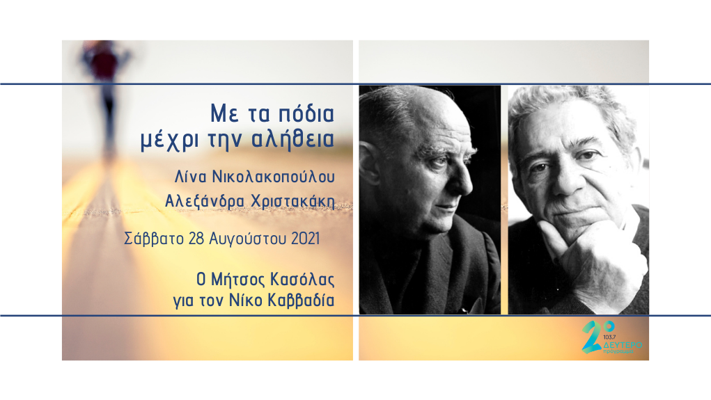 Το Σάββατο 28 Αυγούστου η εκπομπή «Με τα πόδια μέχρι την αλήθεια» είναι αφιερωμένη στον ποιητή Νίκο Καββαδία. Καλεσμένος της Λίνας Νικολακοπούλου και της Αλεξάνδρας Χριστακάκη ο συγγραφέας Μήτσος Κασόλας.