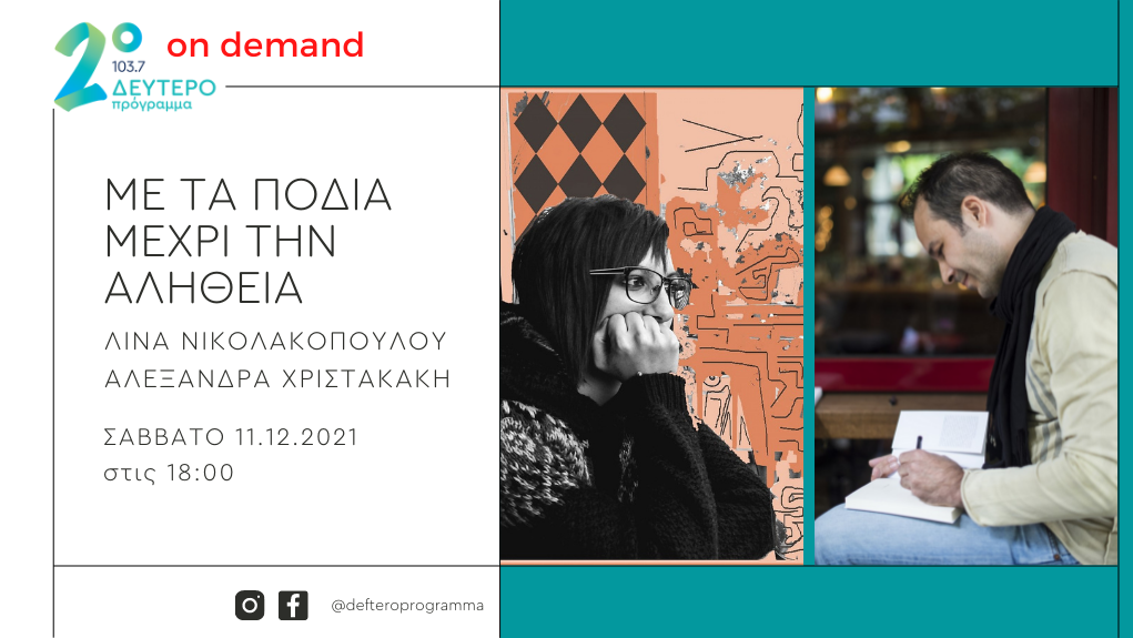 Η ποιήτρια Ηλέκτρα Λαζάρ και ο συγγραφέας Αχιλλέας ///, είναι οι καλεσμένοι της εκπομπής «Με τα πόδια μέχρι την αλήθεια», το Σάββατο 11 Δεκέμβριου 2021 στις 18.00 και στο Δεύτερο Πρόγραμμα 103.7.