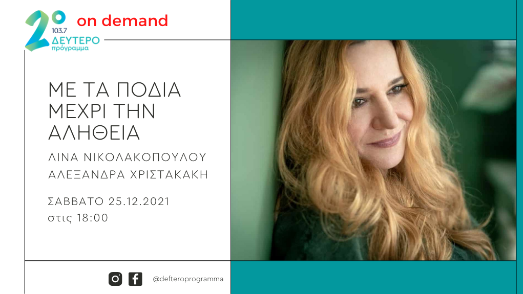 Χριστουγεννιάτικο ρεβεγιόν κάνουν η Λίνα Νικολακοπούλου και η Αλεξάνδρα Χριστακάκη στην εκπομπή «Με τα πόδια μέχρι την αλήθεια» με την βιολονίστρια και συνθέτρια Ευανθία Ρεμπούτσικα, το Σάββατο 25 Δεκεμβρίου, στις 18:00, στο Δεύτερο Πρόγραμμα 103.7.