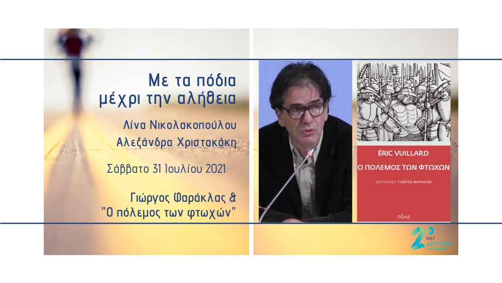 Σάββατο 31 Ιουλίου, στις 6 το απόγευμα, η Λίνα Νικολακοπούλου και η Αλεξάνδρα Χριστακάκη, φιλοξενούν τον Γιώργο Φαράκλα, καθηγητή Φιλοσοφίας στο Πάντειο Πανεπιστήμιο και μεταφραστή του βιβλίου του Eric Vuillard «Ο πόλεμος των φτωχών» (εκδόσεις Πόλις).