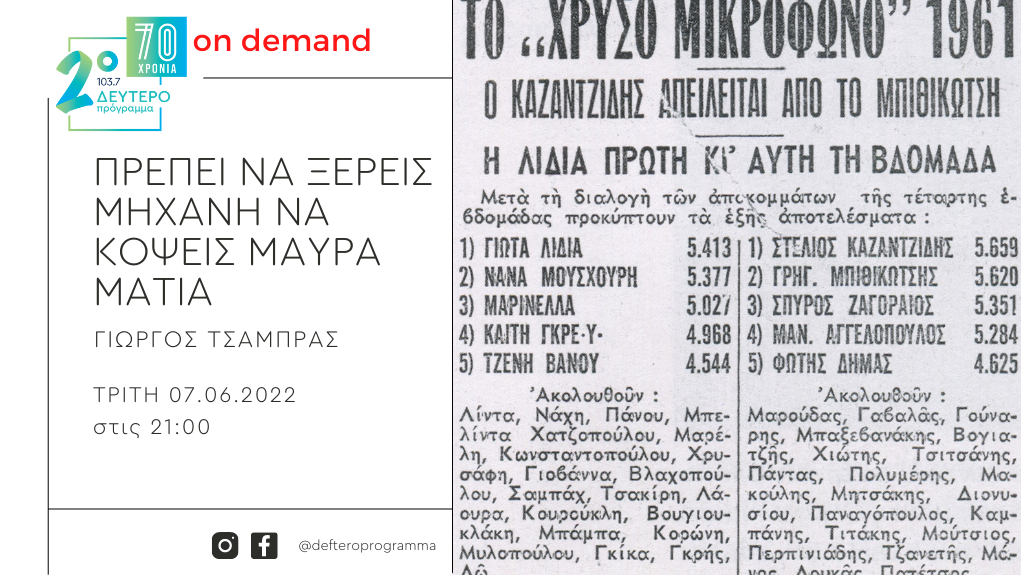 Τρίτη 07 Ιουνίου, 9 με 10 το βράδυ, στο Δεύτερο Πρόγραμμα στην εκπομπή του Γιώργου Τσάμπρα.