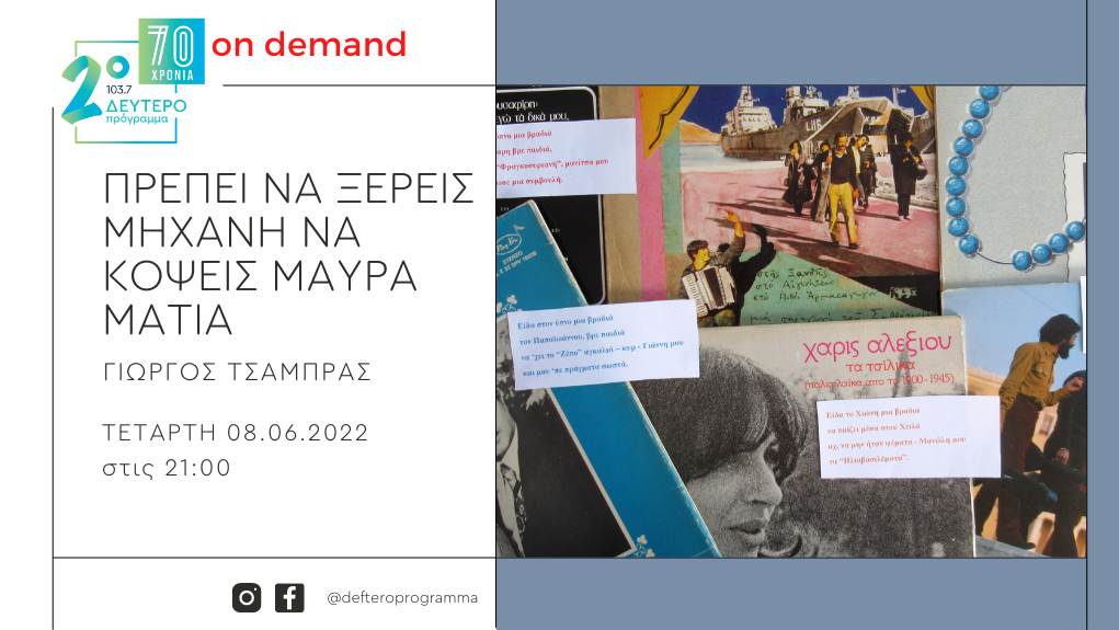 Τετάρτη 08 Ιουνίου 2022, 9 με 10 το βράδυ, στο Δεύτερο Πρόγραμμα 103.7 και στην εκπομπή του Γιώργου Τσάμπρα.