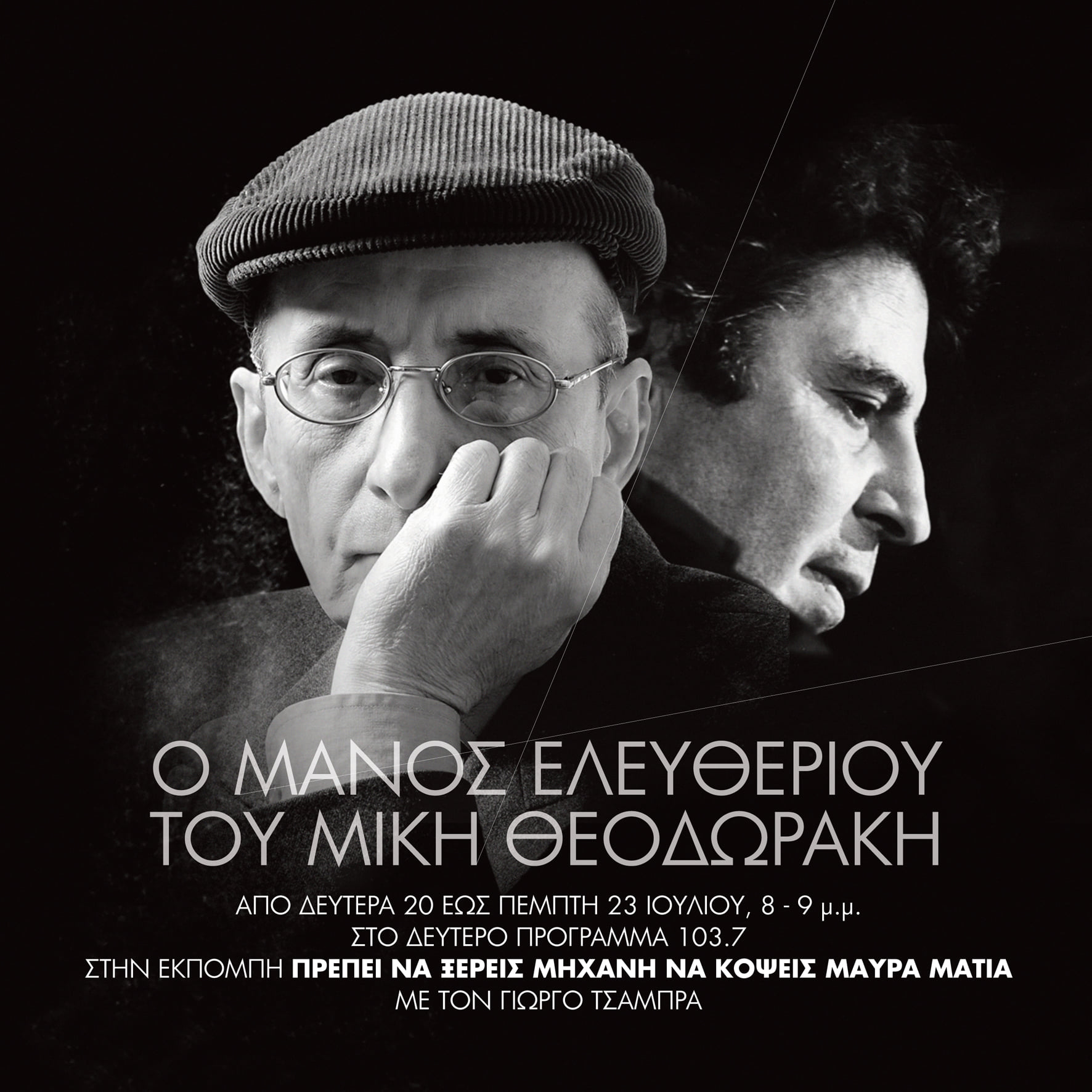Από Δευτέρα 20 έως Πέμπτη 23 Ιουλίου 2020, 8 με 9 το βράδυ, στην εκπομπή του Γιώργου Τσάμπρα. Ο Μίκης Θεοδωράκης είναι ο συνθέτης που έχει μελοποιήσει τους συντριπτικά περισσότερους στίχους του Μάνου Ελευθερίου μέσα από τα χρόνια. Τα πρώτα από τα «Λαϊκά» γράφονται λίγο πριν την δικτατορία αλλά κυκλοφορούν στο εξωτερικό το 1971. Ακολουθούν οι «Αρκαδίες 2 και 3 – για τη μάνα και τους φίλους», η «Νύχτα θανάτου», κάποια από «Τα τραγούδια του αγώνα» – ανάμεσά τους το πολυακουσμένο και στα νεώτερα χρόνια «Ποιος τη ζωή μου / ποιος την κυνηγά» και βέβαια το «Μήπως ζούμε σ’άλλη χώρα;» του 1986 – κυκλοφόρησε τελικά το 1991 – και τα τραγούδια για τις «Πολιτείες Γ και Δ» (1994 και 1996). Στις εκπομπές παρακολουθήσαμε την συνεργασία μέσα από αφηγήσεις τους, εστιάζουμε στις μουσικές, στους στίχους, στα θέματα, στις πρώτες ηχογραφήσεις αλλά και στις κατοπινές ηχογραφήσεις, μέχρι και τις μέρες μας. Πάντα με την πεποίθηση και με στόχο ότι «Πρέπει να ξέρεις μηχανή να κόψεις μαύρα μάτια».