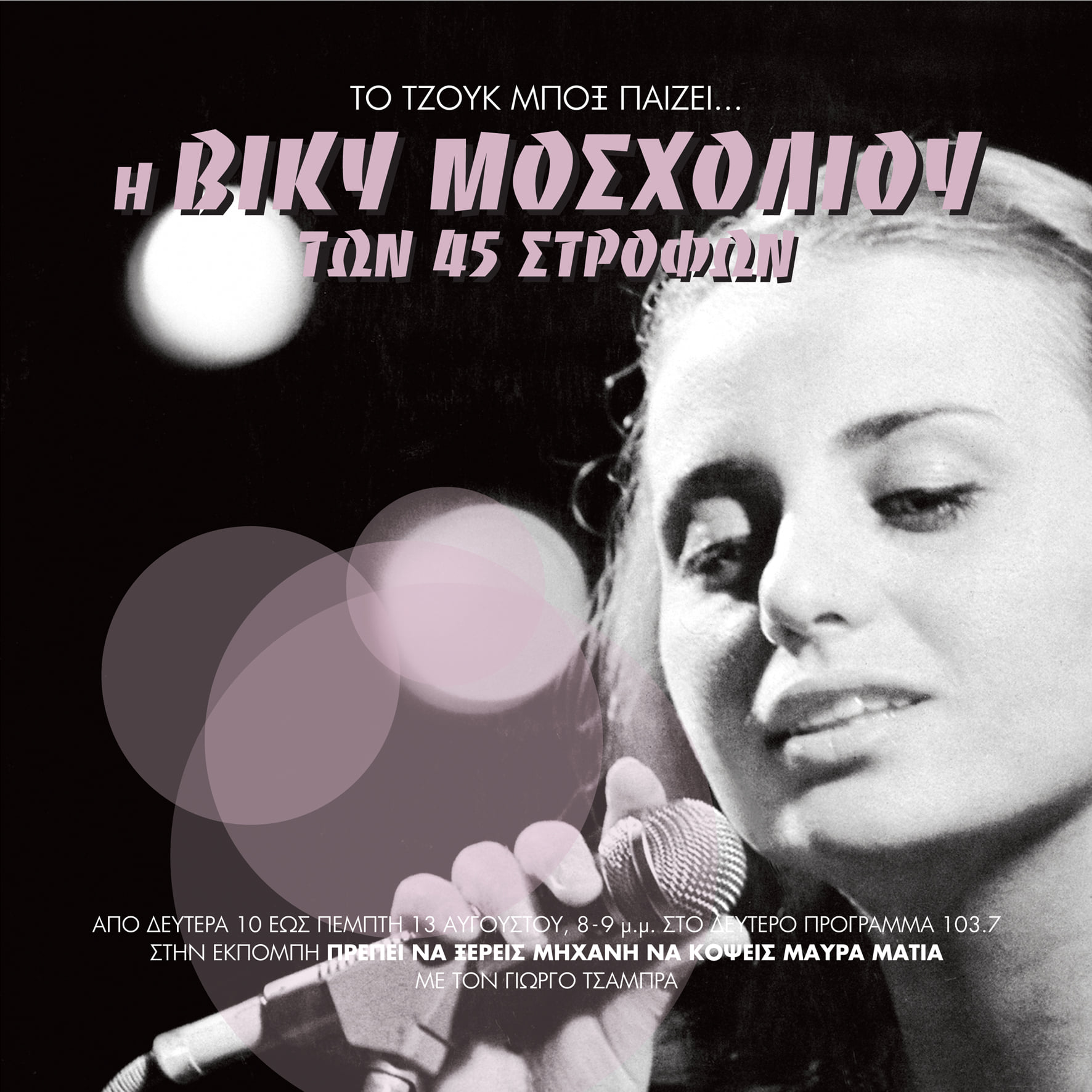 Η Βίκυ Μοσχολιού των 45 στροφών, από Δευτέρα 10 έως Πέμπτη 13 Αυγούστου, 8 με 9 το βράδυ, στο Δεύτερο Πρόγραμμα 103.7.