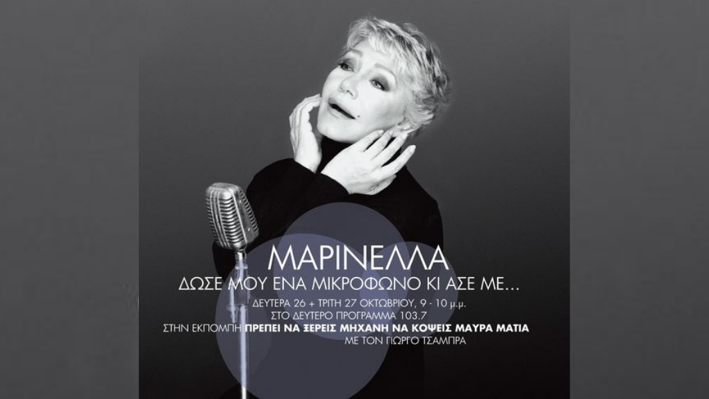 63 χρόνια από την πρώτη ηχογράφηση της Μαρινέλλας. Δευτέρα 26 και Τρίτη 27 Οκτωβρίου, 9 με 10 το βράδυ, στο Δεύτερο Πρόγραμμα 103.7, διαλέγουμε από τα σεγόντα, τα ντουέτα και τα σόλο της. Σε δυο εκπομπές που βαφτίσαμε από δική της φράση : «Δώσε μου ένα μικρόφωνο κι άσε με…». Ήταν – λέει – αρχές Νοέμβρη του 1957, που βρέθηκε για πρώτη φορά στο στούντιο με τον Στέλιο Καζαντζίδη. Για να τραγουδήσουν το «Η πρώτη αγάπη σου είμαι εγώ» του Γιώργου Μητσάκη. Από την «Πρώτη αγάπη» με τον Καζαντζίδη και τον Μητσάκη, φτάνουμε στο «Έχω μάθει πάντα να κοιτάω ψηλά» του Γιώργου Θεοφάνους. Με όσα μεσολάβησαν στην ιστορία, στην ελληνική κοινωνία, στο τραγούδι και στις δικές της επιλογές: Η «συνάντηση» με την Βέμπο, η παράδοση της Κωνσταντινούπολης, «η κυρία δήμαρχος», ο Χατζιδάκις, ο Ζαμπέτας, ο Πλέσσας, ο Χατζής, ο Κραουνάκης και η «Μαρίκα Σουέζ» που «Κυριακή παντρεύτηκε έναν προβολέα», ο Ξαρχάκος, ο Τσιτσάνης, ο Θεοδωράκης «στα περβόλια μες στους ανθισμένους κήπους» και ο Χατζηνάσιος. Αυτά και όσα άλλα χωρέσουν, εναλλάσσονται μέσα απ’ τα χρόνια στις επιλογές της εκπομπής. Πάντα με την πεποίθηση και με στόχο ότι «Πρέπει να ξέρεις μηχανή να κόψεις μαύρα μάτια».