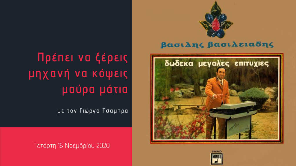 Τετάρτη 18 Νοεμβρίου 2020, 9 με 10 το βράδυ, στο Δεύτερο Πρόγραμμα 103.7. Τραγούδια – επιτυχίες στις αρχές της δεκαετίας του ’70, κυρίως μέσα από μικρά δισκάκια και τζουκ μποξ, όπως καταγράφηκαν τότε σε μια συλλογή μεγάλου δίσκου βινυλίου. Στέλιος Καζαντζίδης, Λίτσα Διαμάντη, Μάνος Παπαδάκης, Μπάμπης Τσετίνης, Δημήτρης Ευσταθίου αλλά και «σόλο»… «Δεν σε πιστεύω», «Μπορεί να έφυγες», «Στου Χαροκόπου και στην Καλλιθέα», «Μια δεκάρα»… Και μαζί, αφηγήσεις από μια συνομιλία με τον Βασίλη Βασιλειάδη αλλά και αποσπάσματα από μια πανεπιστημιακή εργασία γι’ αυτόν. Πάντα με την πεποίθηση και με στόχο ότι «Πρέπει να ξέρεις μηχανή να κόψεις μαύρα μάτια».