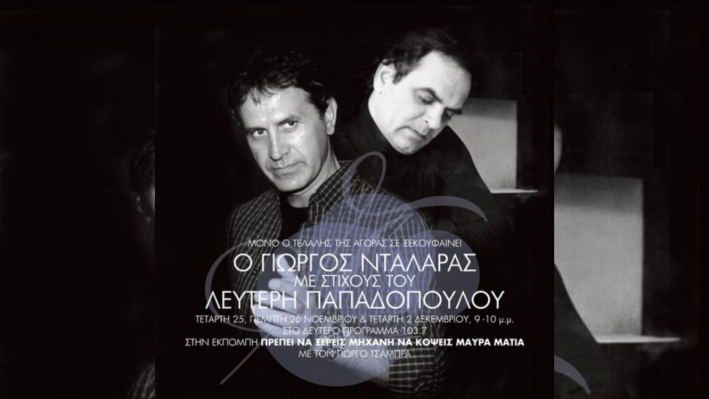 Τετάρτη 25, Πέμπτη 26 Νοεμβρίου και Τετάρτη 2 Δεκεμβρίου, 9 με 10 το βράδυ, στο Δεύτερο Πρόγραμμα 103.7. Με μουσικές του Μάνου Λοΐζοu, του Απόστολου Καλδάρα, του Σταύρου Κουγιουμτζή, του Γιάννη Σπανού, του Στέλιου Βαμβακάρη, του Χρήστου Νικολόπουλου, της Ελένης Καραΐνδρου και αρκετών ακόμη. Ο Γιώργος Νταλάρας έχει ηχογραφήσει  σε πρώτη εκτέλεση  περίπου 60 τραγούδια με στίχους του Λευτέρη Παπαδόπουλου. Aπό το ξεκίνημά του, το 1968 μέχρι και το 2009 – τότε ηχογράφησε το πιο πρόσφατο. Αυτά τα 50 και πλέον χρόνια, έχει τραγουδήσει πολύ και στη σκηνή αρκετά απ’ αυτά τα τραγούδια, αλλά και πολλά ακόμη από την ιστορία του στιχουργού. Δεν ξέρω αν έχουμε στην ιστορία του ελληνικού τραγουδιού άλλη τόσο εκτεταμένη συνύπαρξη δημιουργού – ερμηνευτή. Από τις «Θαλασσογραφίες», το «Να ‘χαμε τι να ‘χαμε» και τα άλλα του Μάνου Λοΐζου, στον «Βυζαντινό εσπερινό» του Απόστολου Καλδάρα και «Στα ψηλά τα παραθύρια» του Σταύρου Κουγιουμτζή. Μετά είναι «Οι Μάηδες οι ήλιοι μου», με τον Στέλιο Βαμβακάρη, αλλά και τον Γιάννη Σπανό και τον Αντώνη Βαρδή αλλά και τραγούδια με τον Δημήτρη Λάγιο και την Ελένη Καραΐνδρου. Στα τέλη της δεκαετίας του ’80, είναι τα τραγούδια με τον Χρήστο Νικολόπουλο. Και στα χρόνια  του 2000, τραγούδια με νεότερους κυρίως συνθέτες. Kαι πολύ περισσότερο, η υπόμνηση επί σκηνής της ευρύτερης ιστορίας του Λευτέρη Παπαδόπουλου (Ξαρχάκος, Λιβανελλί, Πλέσσας κ.α). Στις εκπομπές της σειράς,  περνάνε όλα αυτά τα χρόνια, όλα αυτά τα τραγούδια. Μπερδεύονται αλλά και ξεχωρίζουν στις επί μέρους εποχές και συνεργασίες τους. Πάντα με την πεποίθηση και με στόχο ότι «Πρέπει να ξέρεις μηχανή να κόψεις μαύρα μάτια».