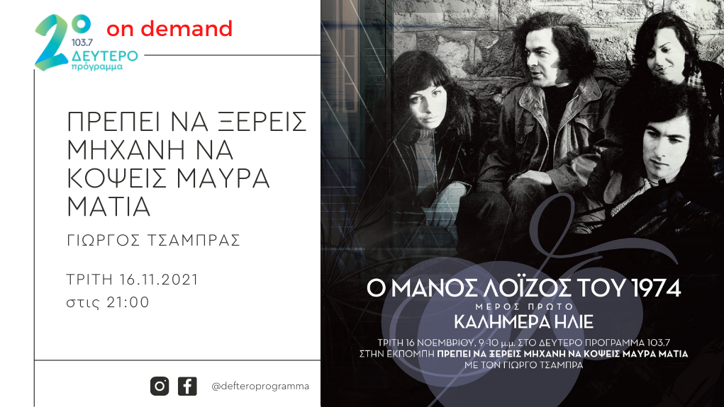 Τρίτη 16 και Τετάρτη 17 Νοεμβρίου, 9 με 10 το βράδυ, στο Δεύτερο Πρόγραμμα 103.7.