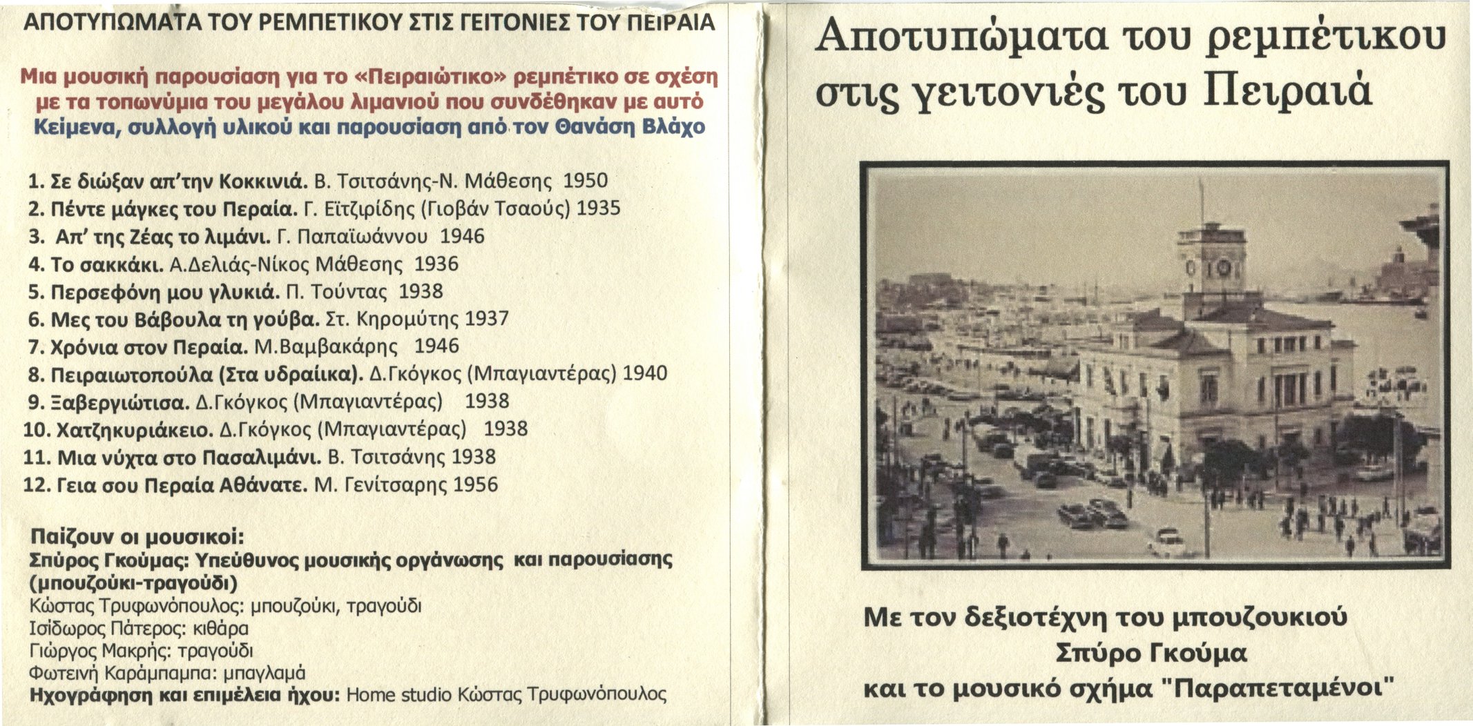 Μαζί με τον Σπύρο Γκούμα, μιλάμε για την ιστορία του με τα συγκεκριμένα τραγούδια αλλά και τη ζωή του στις γειτονιές του Πειραιά που αυτά τραγουδούν. 12 τραγούδια των: Βαμβακάρη, Τσιτσάνη, Παπαϊωάννου, Μπαγιαντέρα, Δελιά, Τούντα, Κερομύτη, Γενίτσαρη και Γιοβάν Τσαούς, για τον Πειραιά και τις γειτονιές του.Όπως τα παίζει και τα τραγουδά μια σύγχρονη μουσική συντροφιά. Πάντα με την πεποίθηση και με στόχο ότι «Πρέπει να ξέρεις μηχανή να κόψεις μαύρα μάτια».