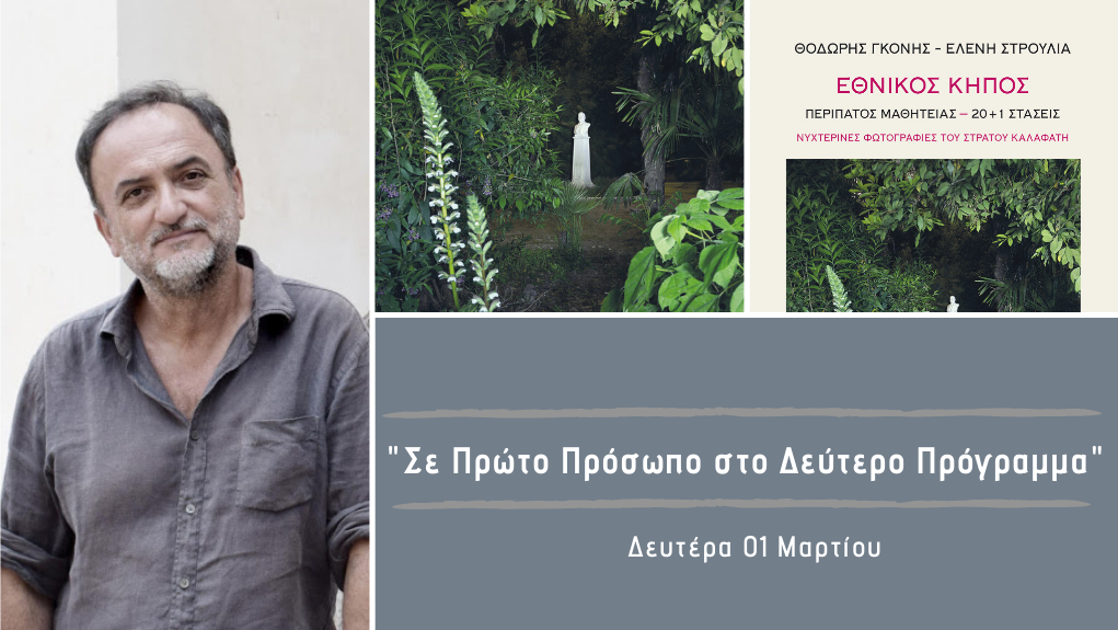 Σήμερα,  Δευτέρα 01 Μαρτίου, ο Θοδωρής Γκόνης μιλάει για το βιβλίο του “Εθνικός κήπος”. Περίπατος μαθητείας – 20+1 στάσεις. Νυχτερινές φωτογραφίες του Στράτου Καλαφάτη. Κυκλοφορεί από τις εκδόσεις Αρμός.