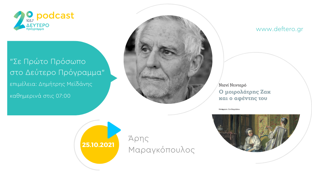 Σήμερα ο Άρης Μαραγκόπουλος μας μιλάει για το βιβλίο του Ντενί Ντιντερό «Ο μοιρολάτρης Ζακ και ο αφέντης του». Η μετάφραση είναι της Εύης Βαγγελάτου Κυκλοφορεί από τις εκδόσεις ΤΟΠΟΣ.