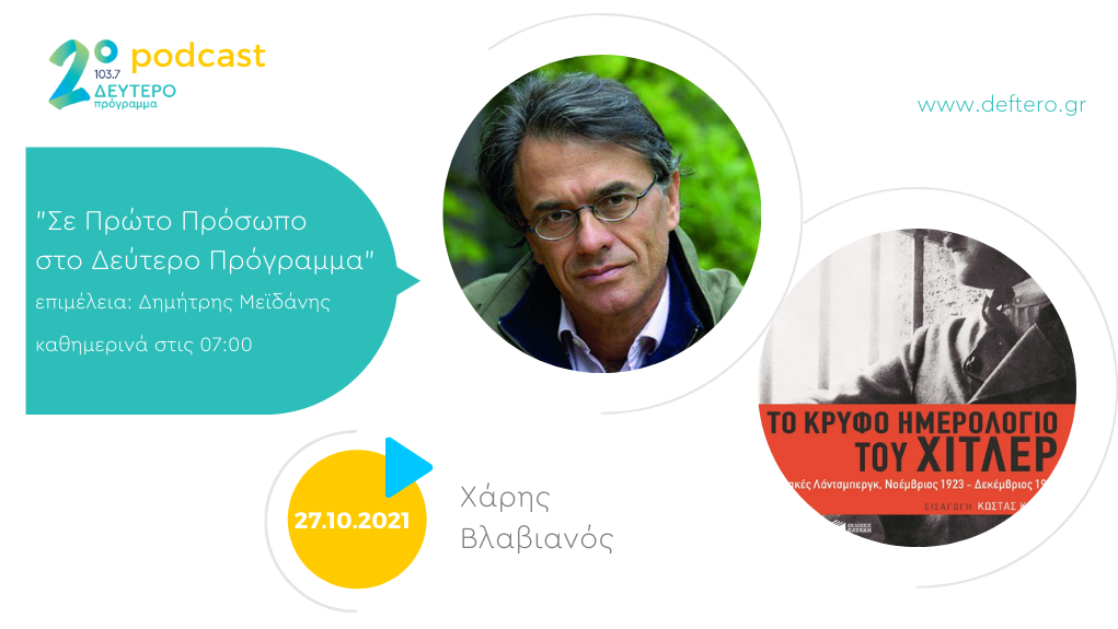 Σήμερα ο Χάρης Βλαβιανός μας μιλάει για το μυθοπλαστικό ντοκουμέντο «Το κρυφό ημερολόγιο του Χίτλερ» (Φυλακές Λάντσμπεργκ, Νοέμβριος 1923 – Δεκέμβριος 1924). Εισαγωγή Κώστας Κωστής. Κυκλοφορεί από τις εκδόσεις Πατάκη.