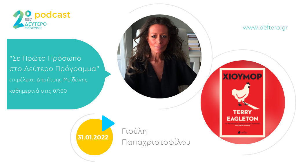 Σήμερα η Γιούλη Παπαχριστοφίλου μας μιλάει για το βιβλίο του Terry Eagleton, «Χιούμορ» (Μια πνευματώδης και παιγνιώδης εισαγωγή στο χιούμορ). Κυκλοφορεί από τις εκδόσεις Πεδίο.