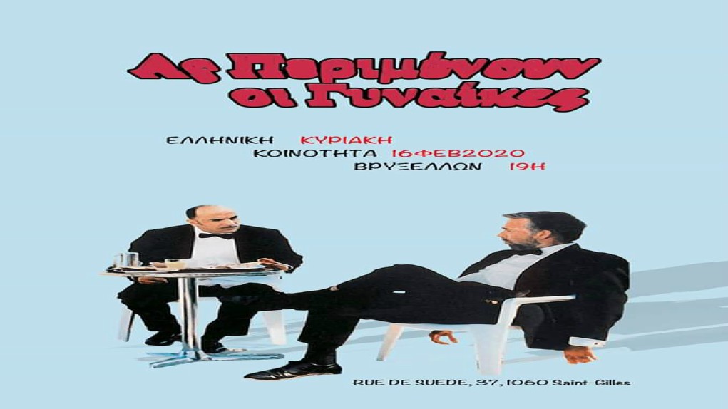 Η Ελληνική Κοινότητα Βρυξελλών διοργανώνει και φιλοξενεί την προβολή της ταινίας του Σταύρου Τσιώλη «Ας Περιμένουν οι Γυναίκες», στο πλαίσιο ενός νέου κύκλου προβολών καθώς και τη δημιουργία μιας άτυπης Κινηματογραφικής Λέσχης που ξεκινά με αυτήν την προβολή την Κυριακή 16 Φεβρουαρίου στα γραφεία της κοινότητας με ελεύθερη είσοδο.