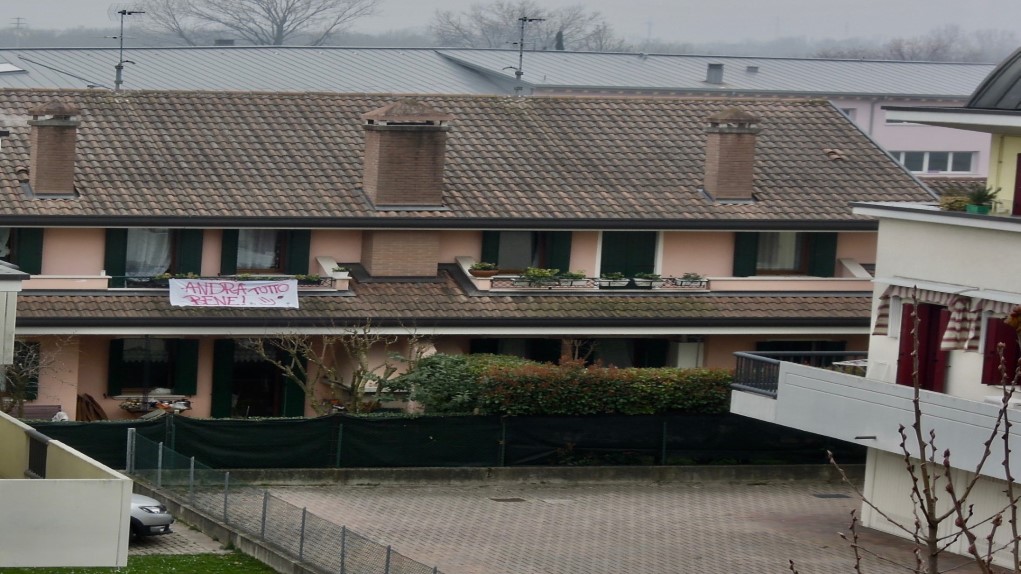 Στην αρχική φωτογραφία του κειμένου, το πανώ στο μπαλκόνι αναγράφει: “Όλα θα πάνε καλά”.