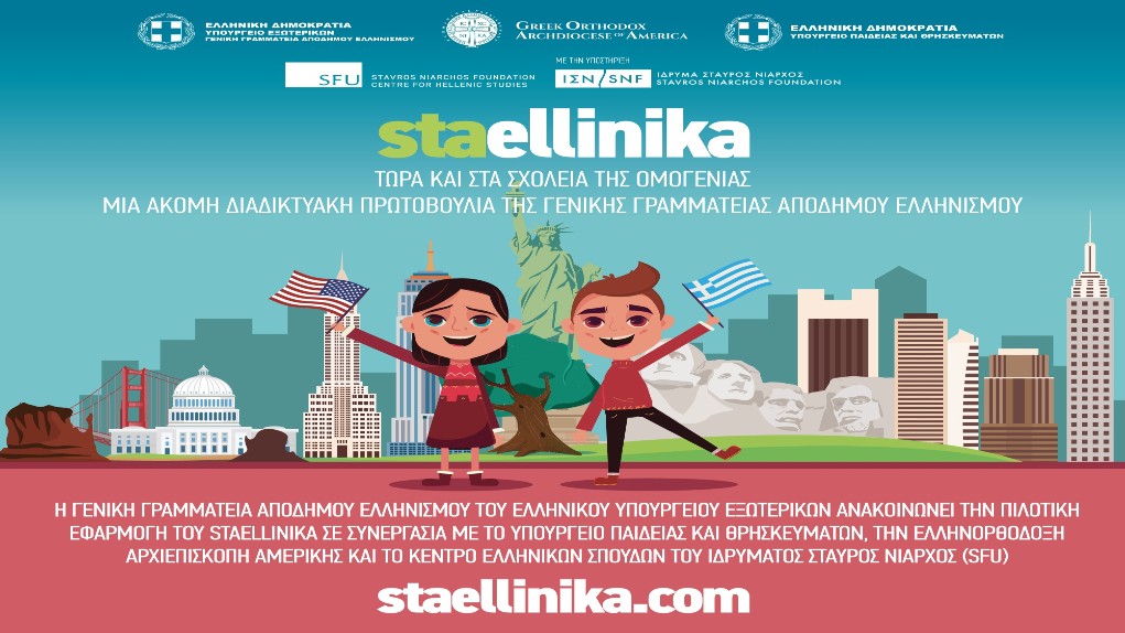 Η Γενική Γραμματεία Απόδημου Ελληνισμού (ΓΓΑΕ), ανακοίνωσε την έναρξη της πιλοτικής εφαρμογής της μαθησιακής πλατφόρμας για την ελληνική γλώσσα staellinika, η οποία θα πραγματοποιηθεί σε επιλεγμένα σχολεία της Ελληνορθόδοξης Αρχιεπισκοπής Αμερικής, σε συνεργασία με το Υπουργείο Παιδείας και Θρησκευμάτων και το Ίδρυμα Σταύρος Νιάρχος Κέντρο Ελληνικών Σπουδών στο πανεπιστήμιο SIMON FRASER, και με την υποστήριξη του Ιδρύματος Σταύρος Νιάρχος.