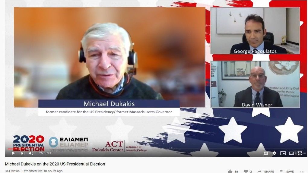 Ο Μάικλ Δουκάκης, πρώην υποψήφιος πρόεδρος των ΗΠΑ και πρώην Κυβερνήτης της Μασαχουσέτης, σχολίασε τις Αμερικανικές Προεδρικές Εκλογές σε διαδικτυακή εκδήλωση του Dukakis Center του ACT και του ΕΛΙΑΜΕΠ την Πέμπτη 5 Νοεμβρίου, σε μία από τις σπάνιες δημόσιες τοποθετήσεις του.